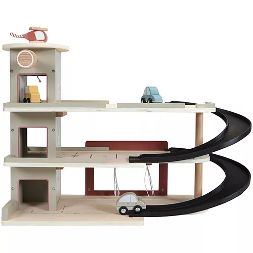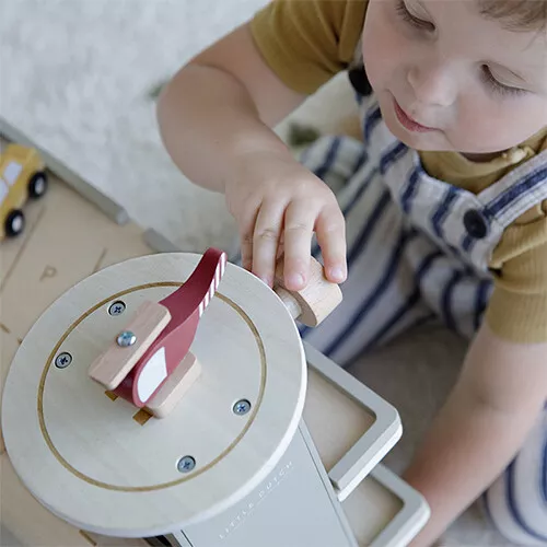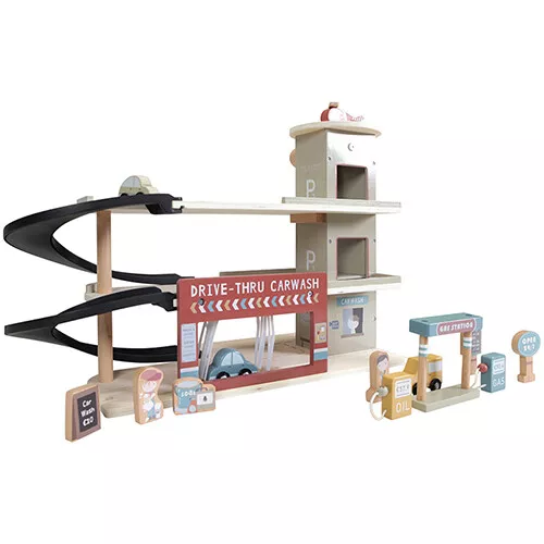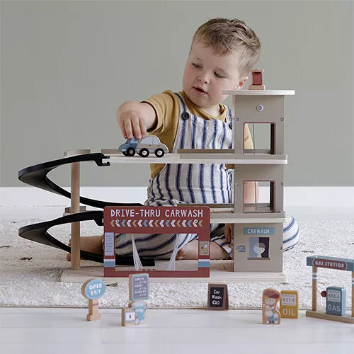 Deze houten garage met servicestation uit de Little Railway Collection van het Nederlandse merk Little Dutch biedt alles wat een speelgoedauto maar nodig heeft. Rijd de auto door de wasstraat, ga tanken bij het benzinestation of zet hem in de parkeergarage.