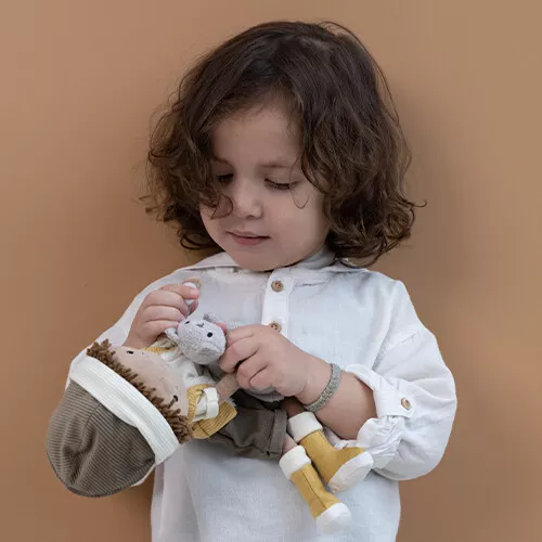 Deze fluweelzachte lappenpop ‘Jake’ van het Nederlandse merk Little Dutch heeft een eigen knuffeltje. Zijn handen zijn voorzien van klittenband, zodat hij het poesje stevig vast kan houden.