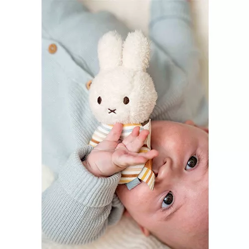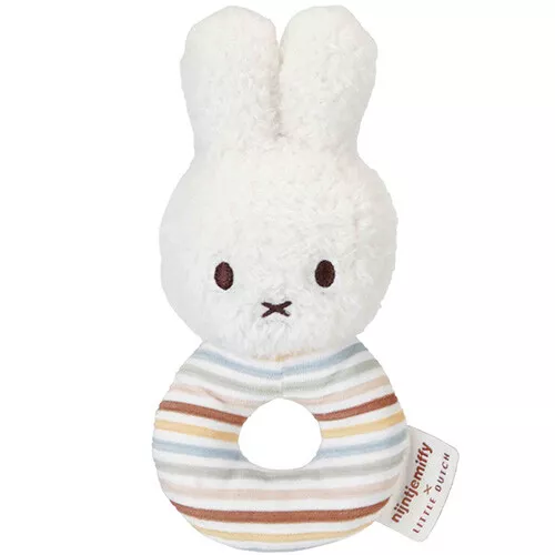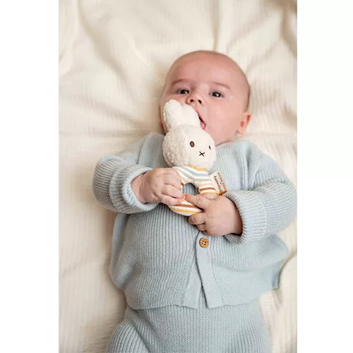 Deze retro rammelaar ‘Nijntje Vintage Sunny Stripes Rammelaar’ van het Nederlandse merk Little Dutch, in samenwerking met Nijntje-Miffy, maakt gezellige geluidjes als het heen en weer bewogen wordt. Bovenop de rammelaar zit een pluche Nijntje die graag een aai over haar zachte bol krijgt.