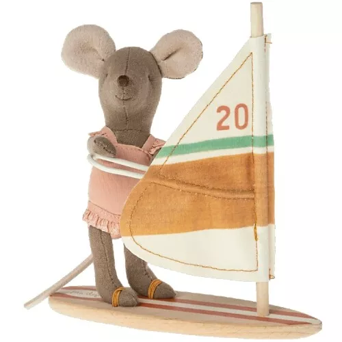 Knuffelmuis ‘Beach Mice – Surfer Little Sister’ van het Deense merk Maileg is goed voorbereid op een dagje op het water. Gekleed in een badpak bedwingt ze met haar windsurfboard iedere golf.
