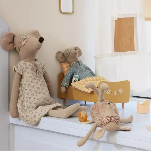 Deze knuffelmuis ‘Medium Mouse – Pyjamas’ van het Deense merk Maileg slaapt graag in de armen van zijn mensenvriendje. Met een gestreepte pyjama en een slaapmasker kruipt deze muizenknuffel zo onder de wol.