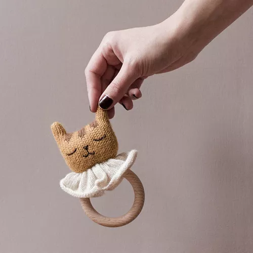 Een rammelaar met een tijgertje van alpacawol ‘Tiger Teething Ring’ van het Franse merk Main Sauvage. Het speelgoed nodigt niet alleen uit tot spelen en knuffelen, maar heeft ook een houten bijtring om de pijn van doorkomende tandjes van baby’s wat te verzachten. Binnenin een belletje wat lieflijk klingelt.