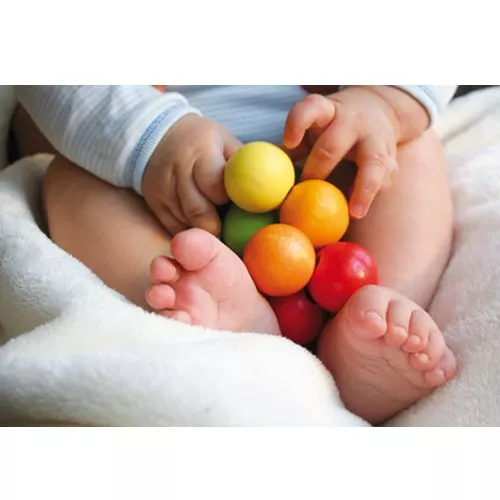 Deze kralengrijper van het Amerikaanse merk Manhattan Toy heeft alle kleuren van de regenboog. Voor de kleine baby een plezier om naar te kijken en naar te grijpen en dan rond te draaien om alle kleuren nog eens te zien. De ronde kralen liggen prettig in het knuistje. Een stimulans voor de oog-hand coördinatie en motoriek. En komen de kralen tegen elkaar dan geven ze een klein klikgeluidje.