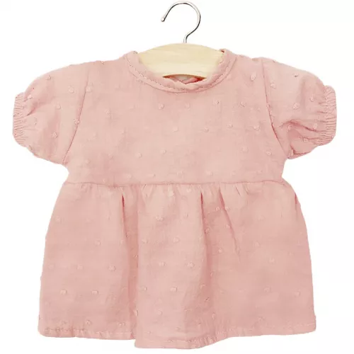 Een roze poppenjurk ‘Babies – Robe Faustine Manches Ballons En Plumetis Rose Thé’ van het Franse merk Minikane met pofmouwtjes en geborduurde, roze stipjes. Een perfecte zomerse outfit voor de liefste pop!