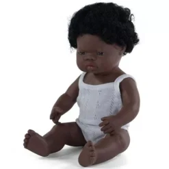 Deze lieve babypop van het merk Miniland heeft een mollig, anatomisch correct jongenslijfje en gezichtje met sprekende, zwarte ogen en een prachtige bos krullen. Het gladde hoofdje, de armpjes en beentjes zijn beweegbaar, waardoor de pop verschillende bewegingen kan maken.