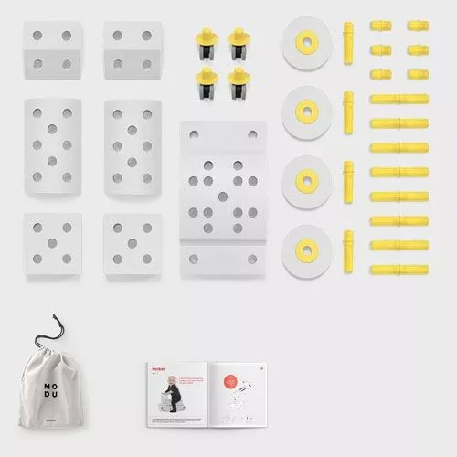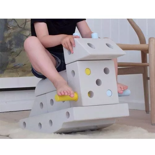 De ‘Dreamer Kit’ is het vlaggenschip van de zachte, modulaire bouwblokken van het Deense merk Modu. Er zijn minstens 12 creaties mee mogelijk zijn, zoals de roller, straight rider of de racer. Grote speelblokken waarmee kinderen al jong leren balanceren, wiebelen, springen, rijden.Â