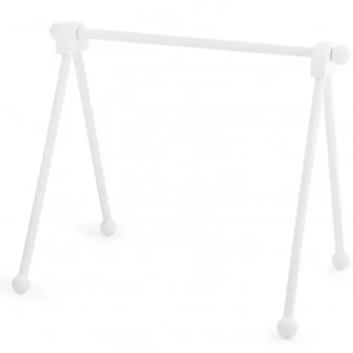 Een wit, houten babygymframe van het Franse merk Moulin Roty, waar activiteitenspeeltjes aan bevestigd kunnen worden.