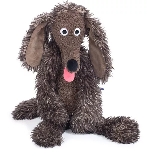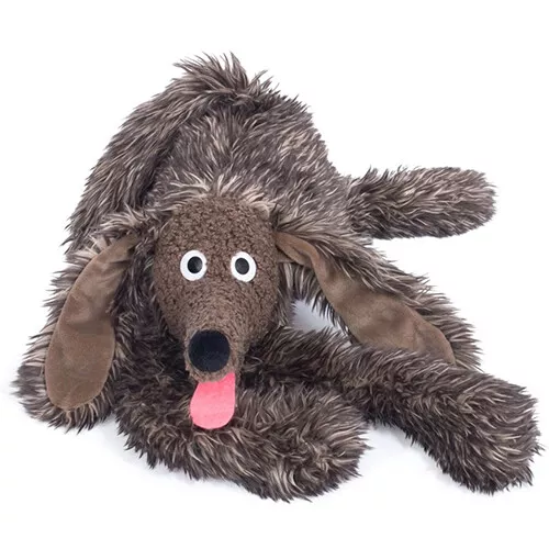 Met zijn wilde vacht, lange tong en grote ogen is deze knuffelhond onweerstaanbaar. Een knuffel die troost biedt en tegelijkertijd de tastzin stimuleert.