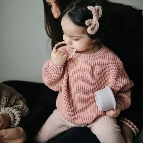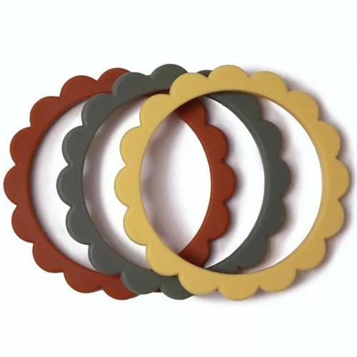 Drie siliconen bijtringen ‘Flower Bracelet Teethers’ van het Amerikaanse merk Mushie. Babyspeelgoed dat is ontworpen om makkelijk vast te grijpen en het tandvlees te masseren bij doorkomende tandjes. Draag hem als armband om de bijtring altijd bij de hand te hebben.