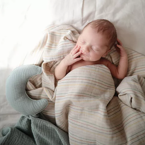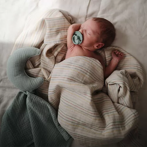 Een zacht mousseline knuffeldoekje ‘Lovey Blanket Moon – Roman Green’ van het Amerikaanse merk Mushie om dichtbij te houden voor een knus en veilig gevoel.