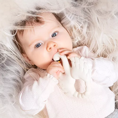 Het babyspeeltje is handgemaakt van natuurlijk rubber. Natuurrubber is milieuvriendelijk, niet-toxisch (vrij van PVC, BPA, ftalaten en nitrosaminen) en 100% veilig om op te sabbelen en te kauwen. Het speelgoed is gekleurd met natuurlijke kleurstoffen.