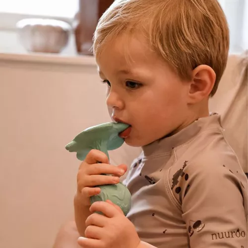 Er is veel te ontdekken voor een kleintje aan dit babyspeeltje ‘Rattle Teether – Sea – Turtle’ van het Deense merk Natruba. Babyspeelgoed waar lekker op gesabbeld kan worden en dat door het reliëf het tandvlees masseert bij het doorkomen van de tandjes. Het grijpspeeltje met reliëf is verrassend voor kleine vingertjes en er klinkt een vrolijk belletje als ermee gerammeld wordt.