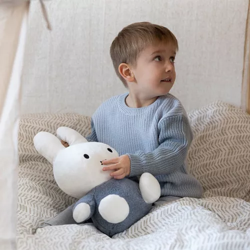 De pluche vacht maakt de konijnenknuffel ontzettend zacht en met het formaat van 35 cm is het konijn perfect om dikke knuffels aan te geven of om leuk neer te zetten in de kinderkamer.
