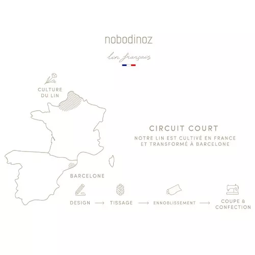 De milieuvriendelijk geproduceerde Lin Français collectie van Nobodinoz wordt gemaakt van Frans vlas dat wordt verwerkt tot linnen in Barcelona. Door het gebruik van lange vlasvezels ontstaat er een flexibele, duurzame stof van hoogwaardige kwaliteit die niet pilt. Het linnen is hypoallergeen, antibacterieel en heeft een hoge vochtopname.
