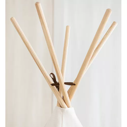 De wigwam heeft vijf houten stokken, waardoor de achterkant van de tent dieper is. De stoffen flappen aan de voorzijde kunnen met lussen vastgezet worden.