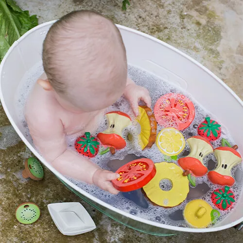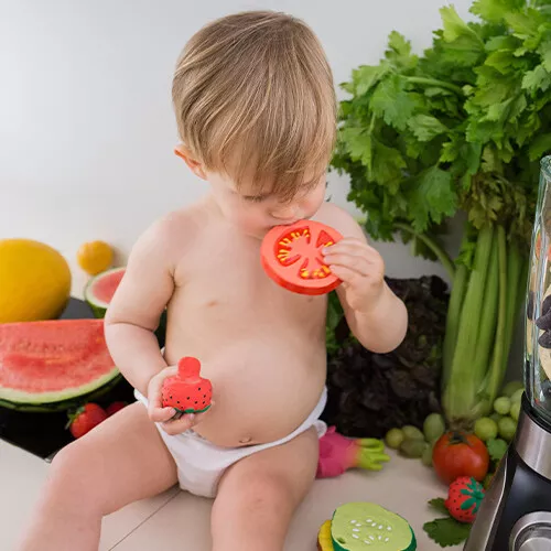 Het grappige bijt- & badspeeltje ‘Renato the Tomato’ van het Spaanse merk Oli & Carol gaat vrolijk mee in bad. De verschillende reliëfs op het babyspeelgoed is verrassend voor de handjes en is prettig bij het doorkomen van de tandjes.