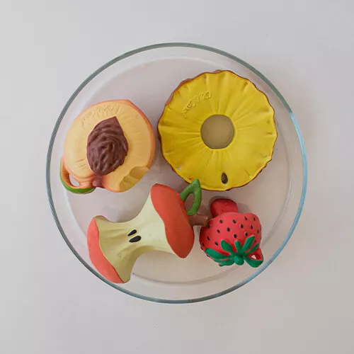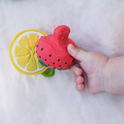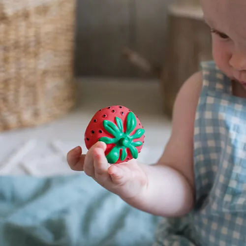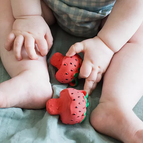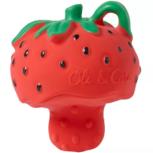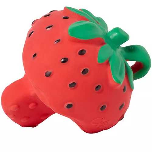 Het kleine bijt- & badspeeltje ‘Chewy To Go – Sweety the Strawberry’ van het Spaanse merk Oli & Carol is prettig bij het doorkomen van de tandjes! Het reliëf op het babyspeelgoed masseert het tandvlees bij het bijten. Bevestig het bijtspeeltje aan een riempje om onderweg te gebruiken.