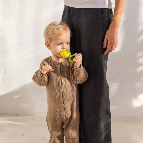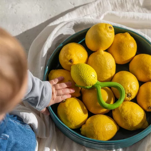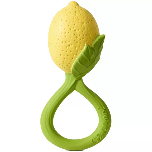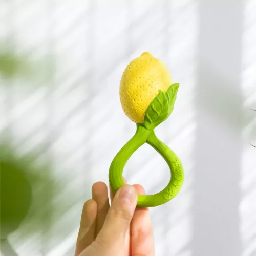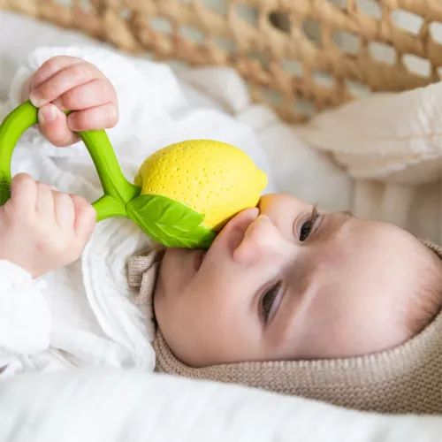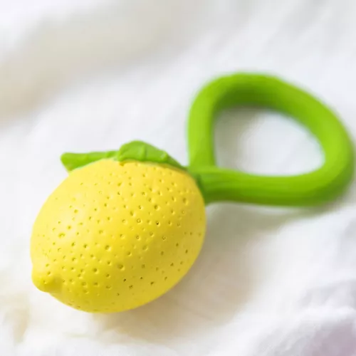 Het handgemaakte, geluidmakende bijt- en badspeeltje ‘Lemon Rattle Toy’ van het Spaanse merk Oli & Carol is prettig bij het doorkomen van de tandjes! Het reliëf op het babyspeelgoed masseert het tandvlees bij het bijten. Daarnaast maakt het speelgoed een vrolijk geluidje wanneer het heen en weer bewogen wordt.