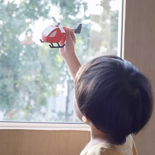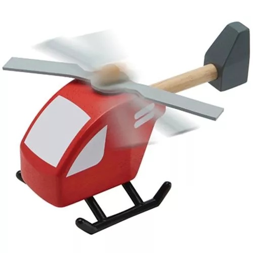 Een rode helikopter van het speelgoedmerk Plan Toys om bijvoorbeeld de brandweerkazerne te versterken. Het kleine, houten helikoptertje heeft draaiende propellers.