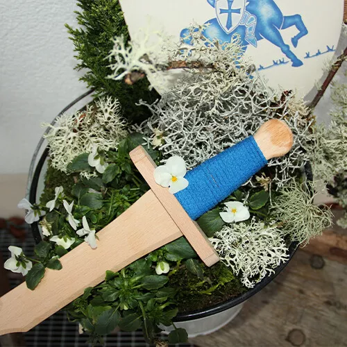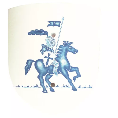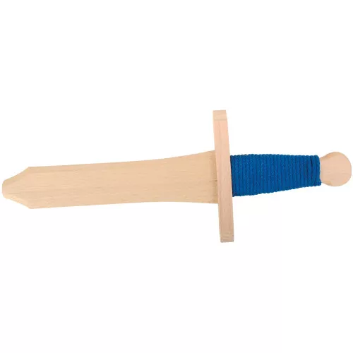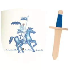 Het kleine zwaard heeft een omwikkeld gevest van blauw koord. Het heeft afgeronde randen en een stompe neus en ligt prettig in kinderhanden. Het speelgoedschild is licht gebogen en is beschilderd met een blauwe ridder te paard. Aan de achterkant heeft het speelgoedschild een leren band waarmee het schild om de arm gehangen kan worden. Zó kan een ridder probleemloos de klappen opvangen en zichzelf verdedigen.