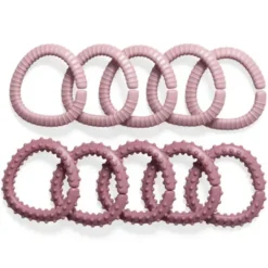 Tien speelringen ‘Toy Links, Blossom Pink’ van het Deense merk Sebra. De babyringen zijn enorm veelzijdig. Gebruik ze als babyspeelgoed, als ophang mechanisme voor de babygym, als wagenspanner, als speenkoord, enzovoort!