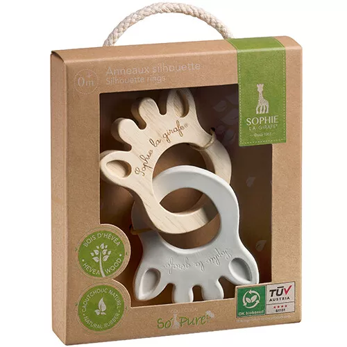 Sophie de giraf bijtspeeltje ‘So’Pure Silhouette Bijtring’ met hout en natuurrubber om het tandvlees verlichting te geven! Door de twee verschillende materiaalsoorten kan op een snelle manier de pijn van de doorbrekende tandjes verzacht worden.