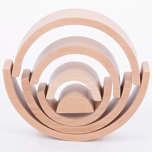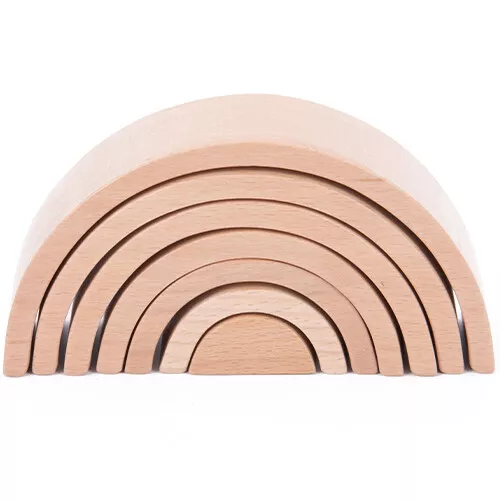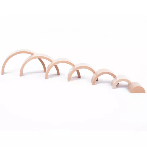 Het stapelspeelgoed, mooi uitgevoerd in naturel hout, bestaat uit zeven bogen, die op en in elkaar passen. De bogen kunnen op diverse manieren gestapeld worden om mooie bouwwerken te maken. Dat vraagt enige creativiteit en zoeken naar evenwicht.