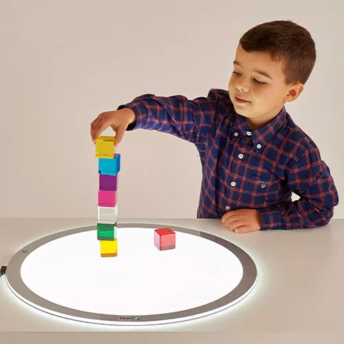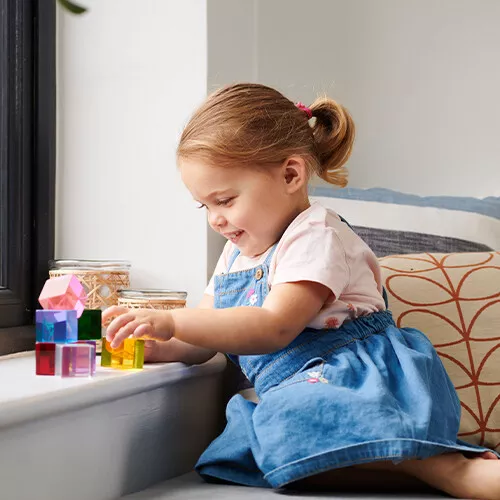 De gladde speelgoedblokken voelen interessant aan en zijn dankzij het transparante materiaal fascinerend om mee te spelen. Houd verschillende kleuren tegen elkaar, zodat er nieuwe kleuren ontstaan en gebruik de blokken met een zaklamp, lichtbak of in de zon voor een verrassend effect.