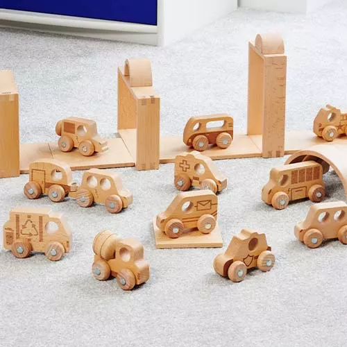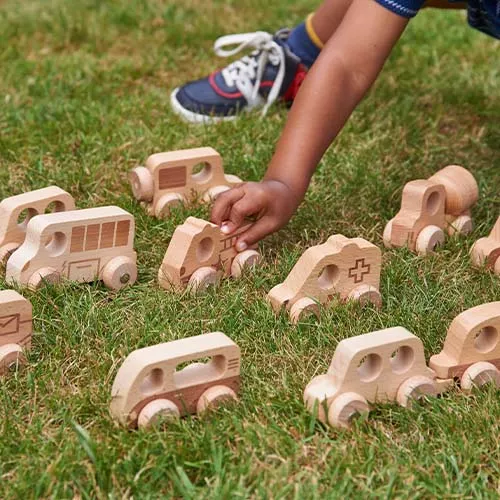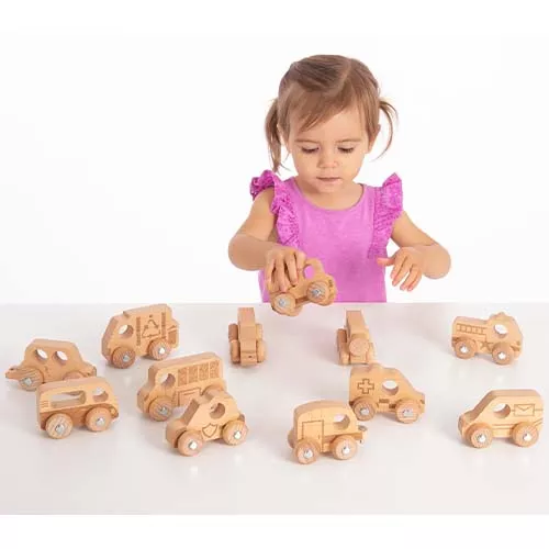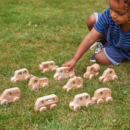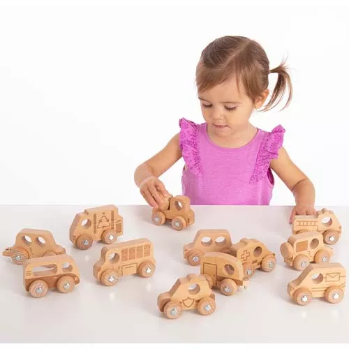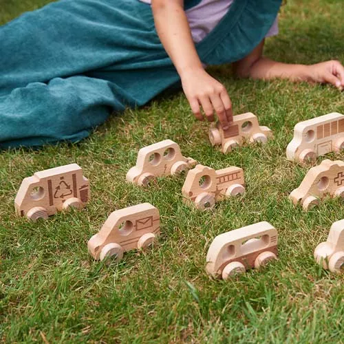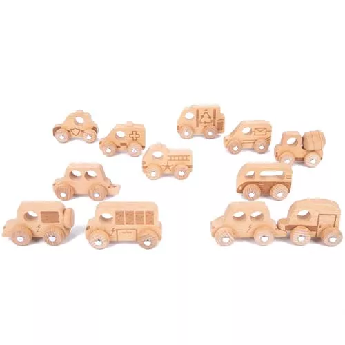 Door de uitsparingen in de wagens zijn de 12 houten speelvoertuigen makkelijk vast te pakken door kleine handen.