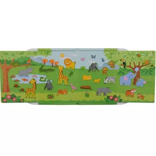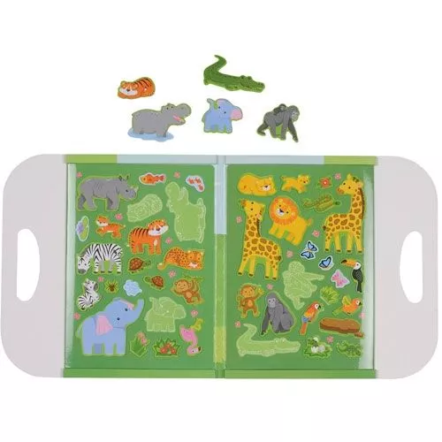 De speelset bestaat uit het magnetische omslagboek met een mooie print en 2 kartonnen platen met uitdrukbare magneten van jungle- en savannedieren.