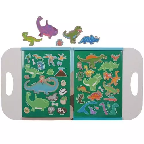 De speelset bestaat uit het magnetische omslagboek met een mooie print en 2 kartonnen platen met uitdrukbare magneten van verschillende dino’s.