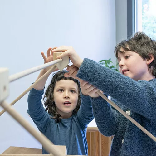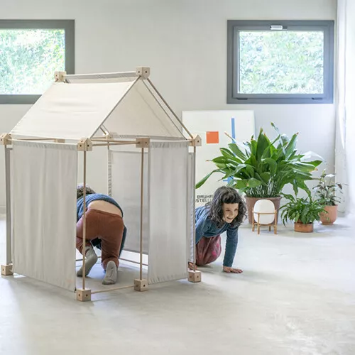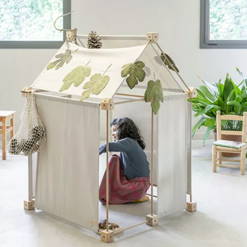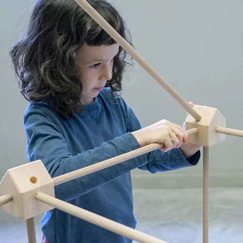 Kinderen bouwen prachtige bouwwerken met het educatieve constructiespeelgoed ‘Large Kernel – Kreema’ van het merk Trígonos met houten blokken, stokken en lappen stof. Wordt het een speelhuis, leeshoek, theater; jonge architecten krijgen vrij spel!