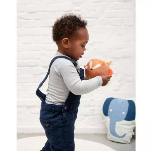 Knijpen baby’s Mr. Fox in zijn oren, dan knisperen die vrolijk. Schudden ze met de stoffen bal, dan klinkt een aangenaam belletje. En komen de eerste tandjes door, dan biedt een bijtring soelaas.Â