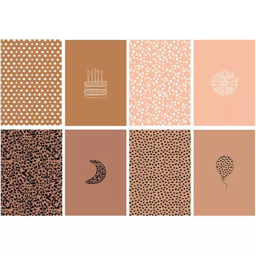 Stuur een lieve boodschap of felicitatie met een van de acht ansichtkaarten van het Nederlandse merk vanPauline. De kaarten hebben originele prints van vanPauline zelf.