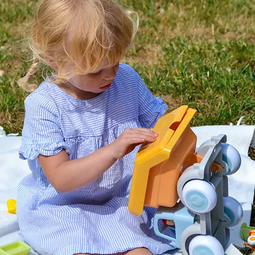 Een leuke speelgoedvrachtwagen met draaiende wielen en bewegende laadbak voor zowel binnen als buiten.